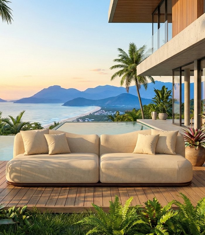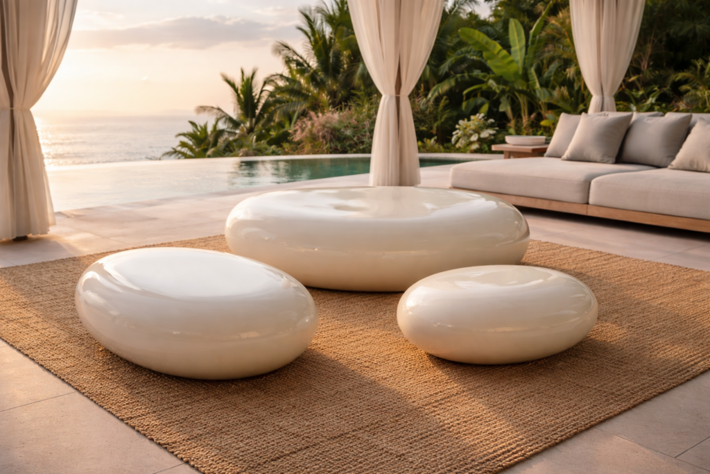 Móveis pensados para áreas externas unem design, resistência e permanência. Materiais preparados para enfrentar sol, chuva e variações de clima permitem que o conforto permaneça, dia após dia, sem concessões estéticas.