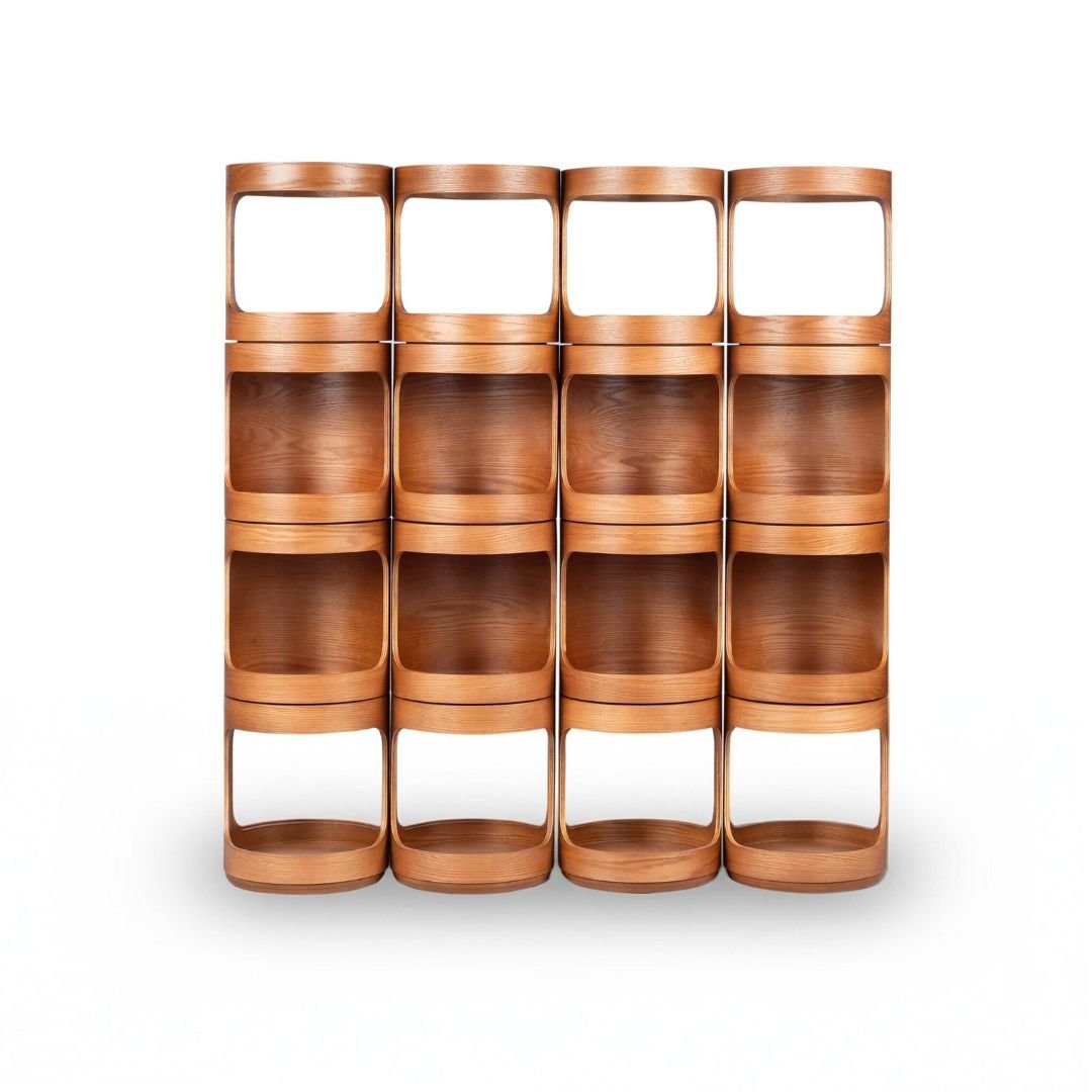 Suas formas curvas suavizam a composição e criam nichos que emolduram objetos com elegância, permitindo transparência visual e fluidez no espaço.